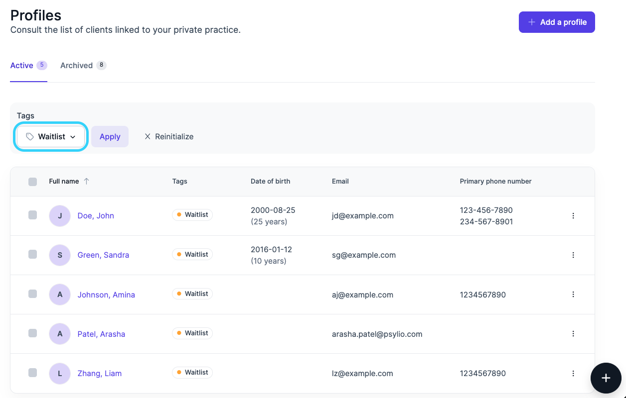 Psylio lets you manage a waiting list using tags, making it easy to identify, organize, and track people who are waiting for services directly from the profiles list.
