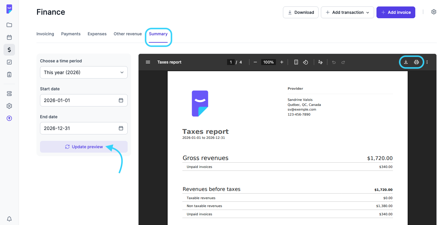 In Psylio, you can generate a summary report of your finances for a selected period.