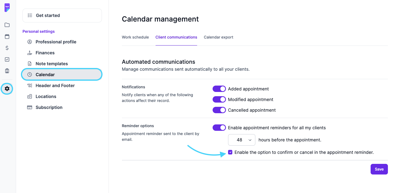 To enable or disable appointment reminders: In your account, head to Settings > Calendar > Client Communications. Select the option Enable appointment reminders for all my clients. Set the notice period for when reminders will be sent before an ...
