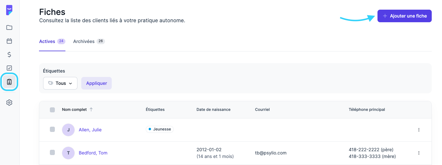 Psylio vous permet de consulter séparément vos dossiers et votre liste de client·es ou d'élèves. Cette distinction facilite la gestion des suivis ainsi que des personnes actuellement suivies ou en attente de services. Qu’est-ce qu’une fiche ? La ...