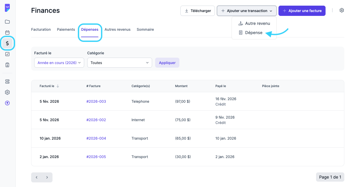 - Accédez à la section Finances, puis à l’onglet Dépenses ou Autres revenus.
