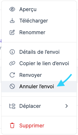 L’état de l’envoi devient alors Annulé, et le lien envoyé par courriel au destinataire n’est plus valide.