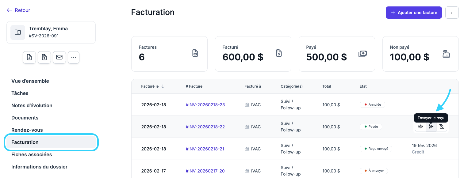 Vous pouvez marquer une facture comme payée et envoyer le reçu au moment de la création de la facture ou plus tard, directement depuis l’onglet Facturation du dossier. Option 1 — Envoyer le reçu lors de la création de la facture Si le paiement est ...