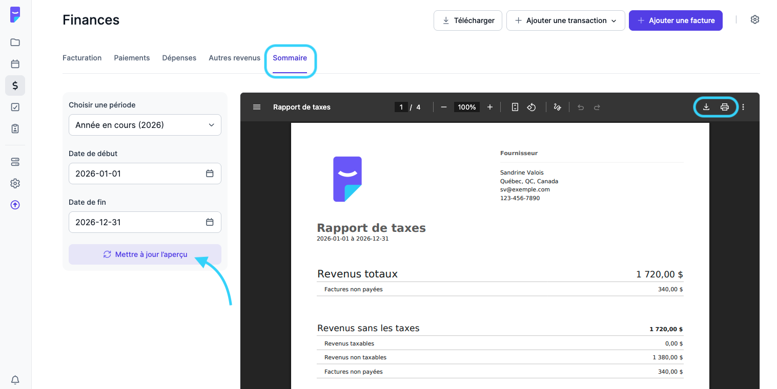 4. Pour télécharger ou imprimer le rapport, utilisez les icônes situées en haut à droite de l’aperçu.