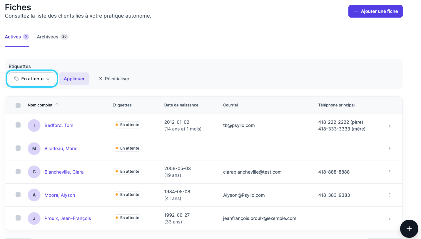 Psylio vous permet de gérer une liste d’attente à l’aide des étiquettes, afin de repérer, organiser et suivre facilement les personnes en attente de services depuis la liste de fiches.