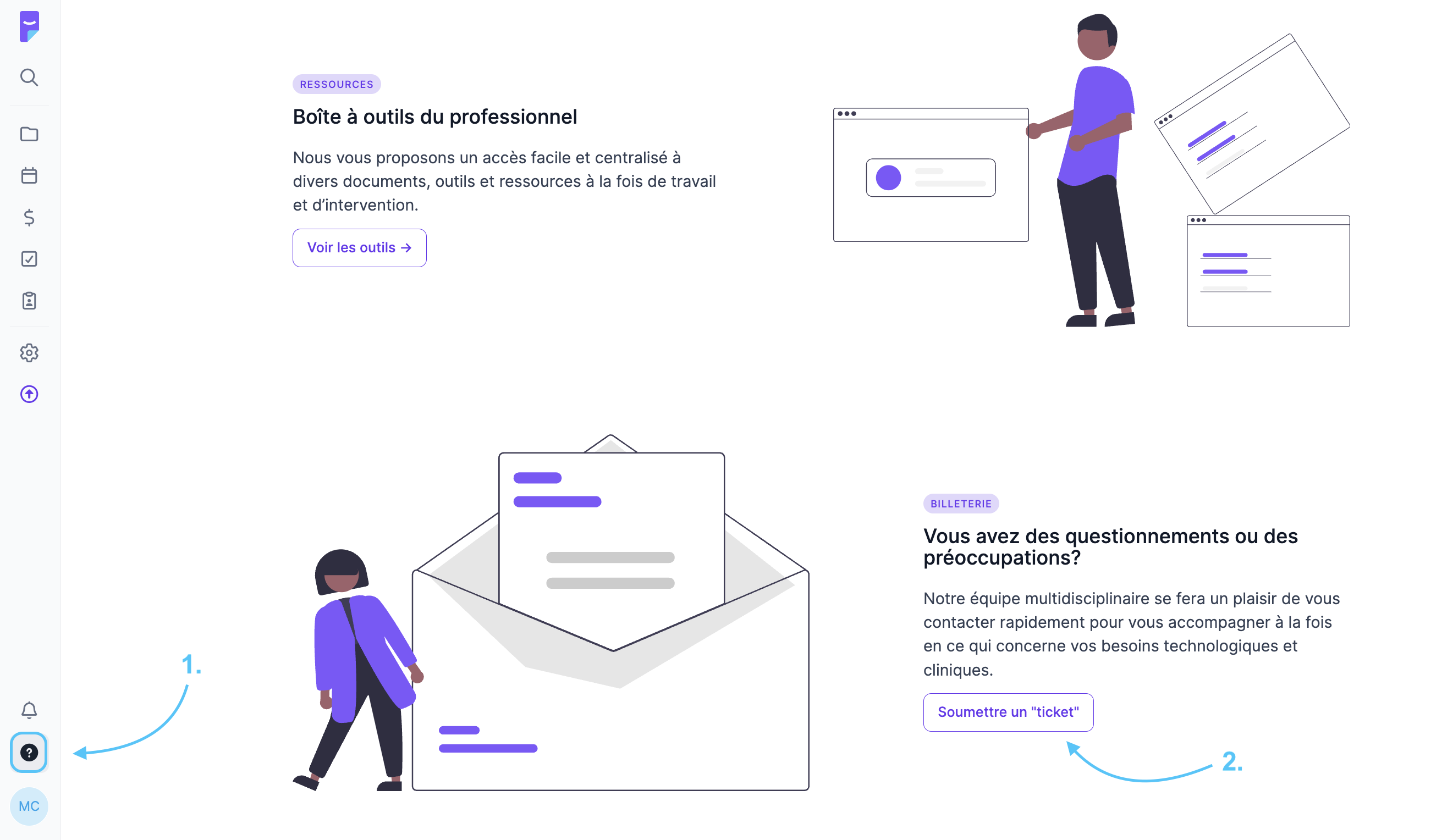 - En bas du menu de gauche, cliquez sur l'icône représentant un point d'interrogation. Cela vous dirigera vers la page Ressources et Soutien.