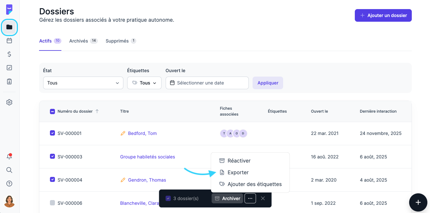 Vous pouvez exporter vos dossiers en toute autonomie, directement depuis la plateforme, ou contacter notre équipe pour demander l’exportation complète de vos données.